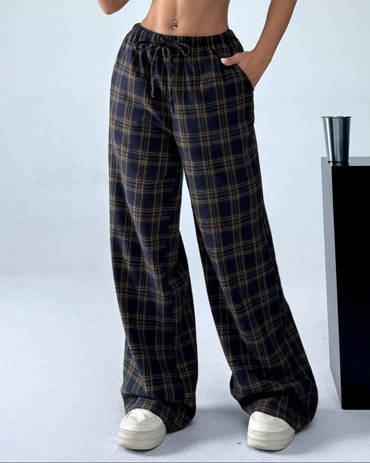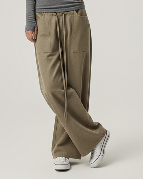 Flowy High-Waisted Trousers - Adjustable Drawstring - Gray